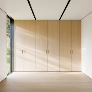Configurable full-height storage system White oak cabinet doors (upgrade) Custom groove handles CNC machine precision cut components Premium European hardware with soft-close drawers